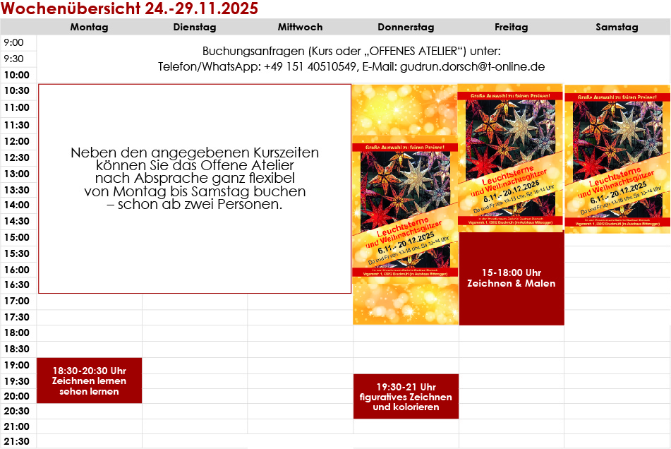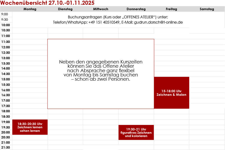 Sie können sich für keinen festen Termin entscheiden? Dann ist das „Offene Atelier“ sicherlich die geeignete Variante für Sie. Jenen Sonntagabend finden Sie die Termine für die darauffolgende Woche im „Wochenplan“