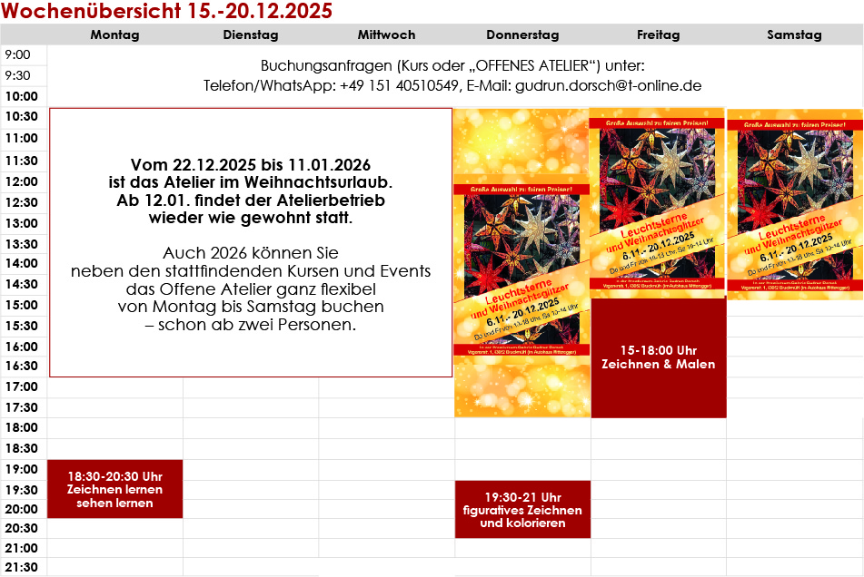 Sie können sich für keinen festen Termin entscheiden? Dann ist das „Offene Atelier“ sicherlich die geeignete Variante für Sie. Jenen Sonntagabend finden Sie die Termine für die darauffolgende Woche im „Wochenplan“